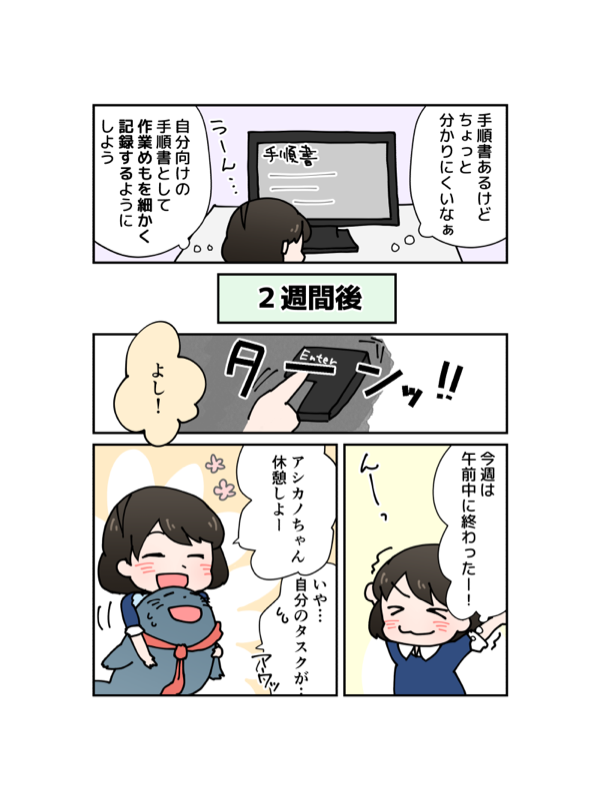 同じ作業を何度か繰り返すことでタスクにかける時間、タスクをこなすのに必要なやる気も自然と減少してくると思いますが、自分向けの手順書を作ることでより早く「ロボット」が育ち、時間もやる気も早く減少させることができます。