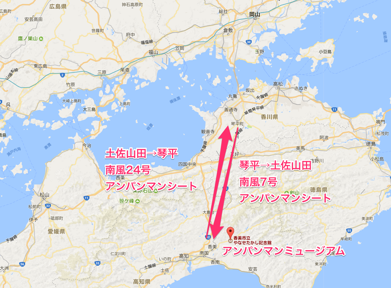 - 瀬戸大橋アンパンマントロッコ、土讃線アンパンマン列車(南風)、ゆうゆうアンパンマンカー(高徳線うずしお、徳島線剣山)に乗るのは必須
