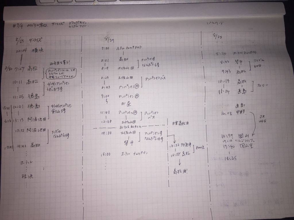 そこで立てたプランをA4スケッチブックに書き起こし・・アンパンマン列車がハマらない場合「乗換案内」で乗車時間と乗車する特急の号車をメモします。