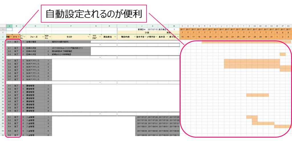まずは項番、ステータス、ガントチャート部分のセルが自動反映されるのが便利でした。スマホで入力することもあるので、入力項目は少ないほど助かるんですよね。