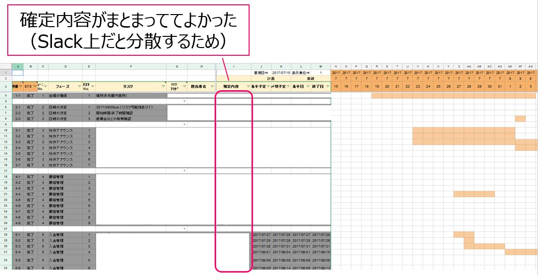 なるほど、それは気づきませんでした。あと、こうしたWBSには珍しいですが「確定内容」の列はよかったです。Slackのやりとりで、結局結論どうなったかが追いづらいことがあったので、結論が一箇所にまとまっていて安心でした。