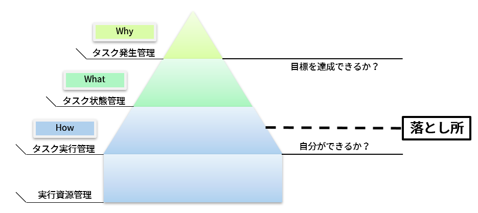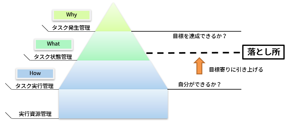 タスク実行管理の仕組みを改善したり、タスク実行資源管理で自分のエネルギーや時間を作り出すことに加え、タスク発生管理を強化することで、自分のキャパシティが広がり、落とし所を少しずつ目標中心寄りにすることができます。もちろん同時に、正しい目標設定&目標を達成できるタスクへの適切な分解技能もここでは求められます。