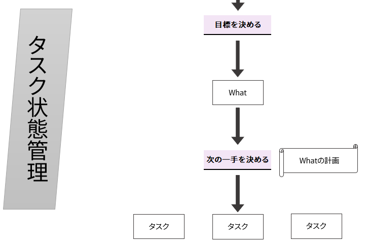 しかし、タスクにはそのタスクの目標があります。その目標を達成するための最短の打ち手を考えるのが、タスクを目標中心に考えるということになります。この行いは、タスク管理4.0で言うタスク実行管理の上流にあるタスク状態管理内の、「どんなタスクなら目標を達成できるか?」という観点からタスクを計画する工程、「Whatの計画」に属します。