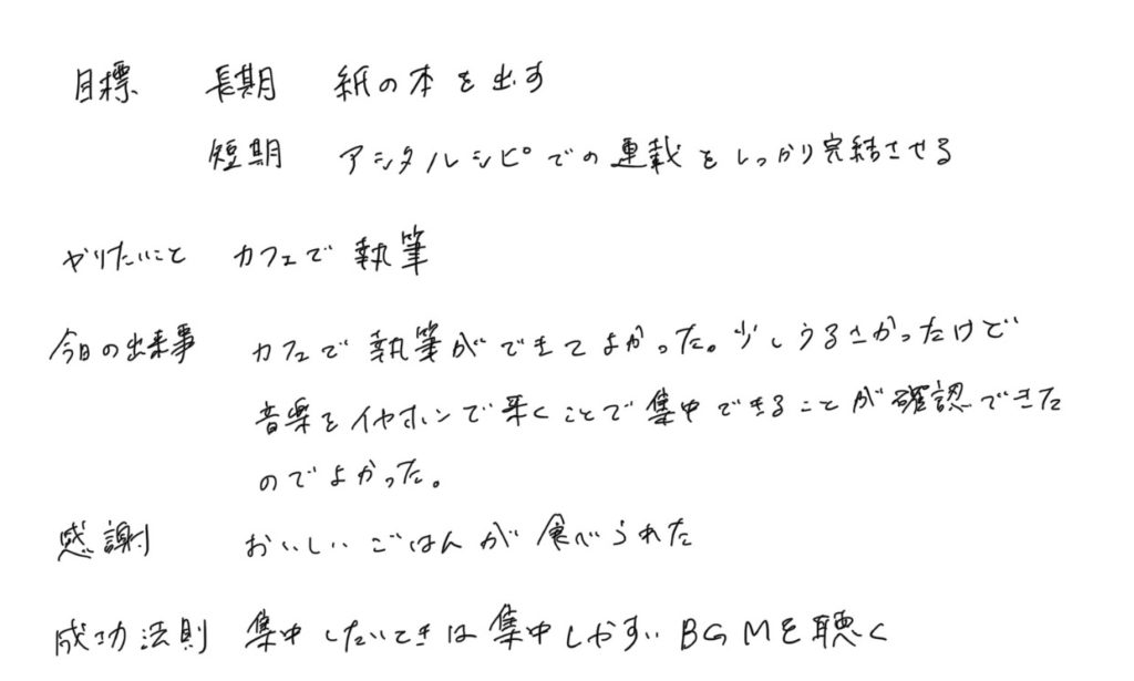 目標に関することでも、それ以外でも構いません。人は毎日目標に向かってそんなに行動できるわけではないですからね(もちろん行動できる人もいます)。