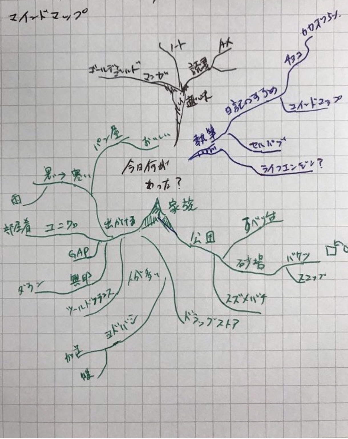 たとえば先ほどのマインドマップの画像で左下に伸びるマインドマップを見てみると 「今日何があった →家族 →出かけた →ユニクロ e t c . 」と展開しているのがわかります 。