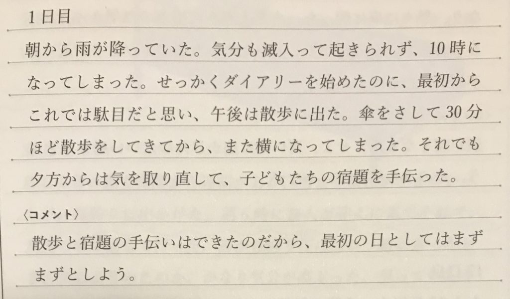 日記の書き方としては、行動を中心に日記を書き、担当医に見てもらって、コメントをもらいます。