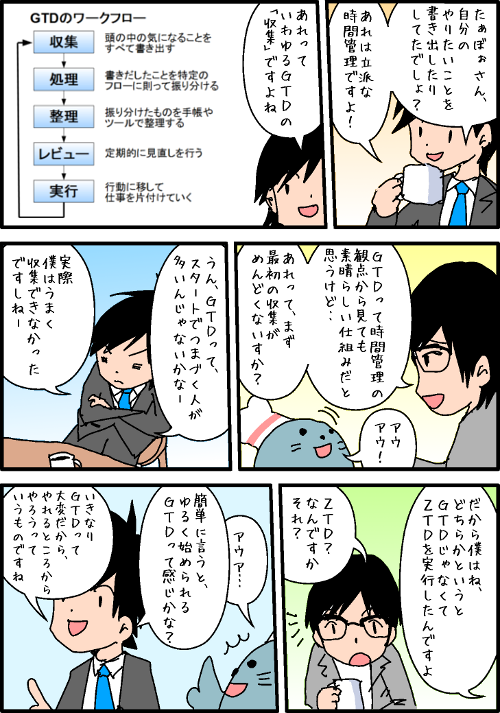 これはブログ「Zen Habits」の著者であるババウタ氏が提唱する「Zen to Done」の略で、GTDのシステムを一気に完璧に作り上げようとはせずに簡単な習慣から少しずつ慣らしてゆくことで、最終的にGTDを同じ状態へもってゆこうというプロセス指向の考え方をしています。