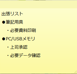 出張が決定したら、「出張のときにいるものリスト」を付箋に書き出し、モニタの端っこに貼っておいてもいいでしょう。