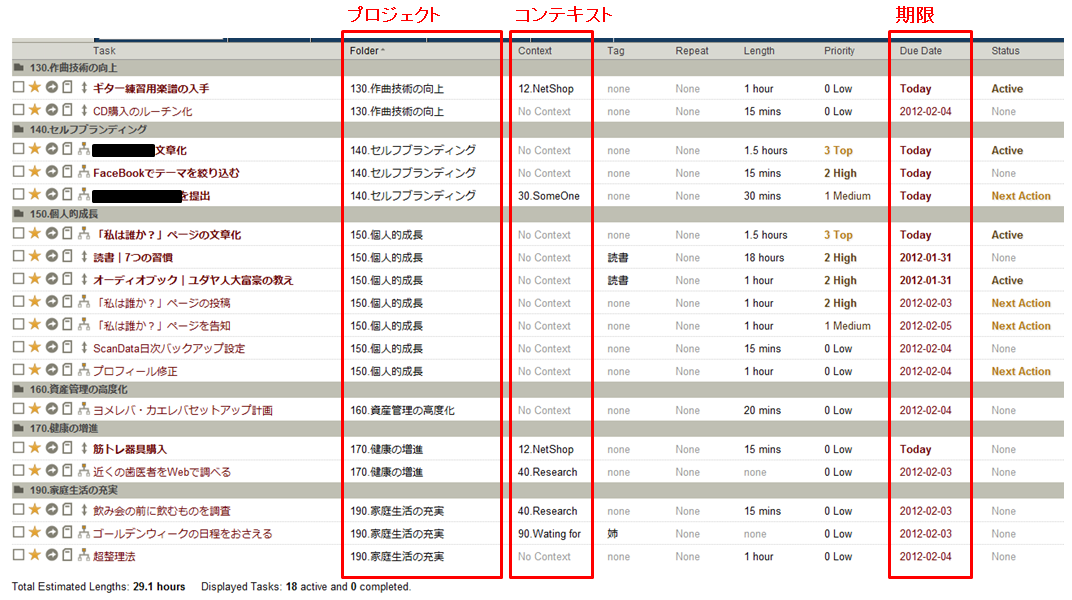 1つ目のリストでは、いつやるかを判断する為にプロジェクトやコンテキスト、期限などでタスクを分類するのが一般的でしょう。私もそうしています。