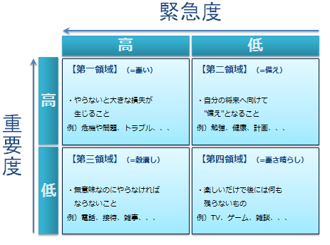 まずはそれぞれの領域の特徴を簡単に紹介しましょう。尚、第一から第四という数字の呼び方では、今いち私のグルメなハートに火がつかないので、大橋悦夫さんの著書「今を大切にして成果を5倍にする「時間畑」の法則」で用いられている呼び名を用いることにします。