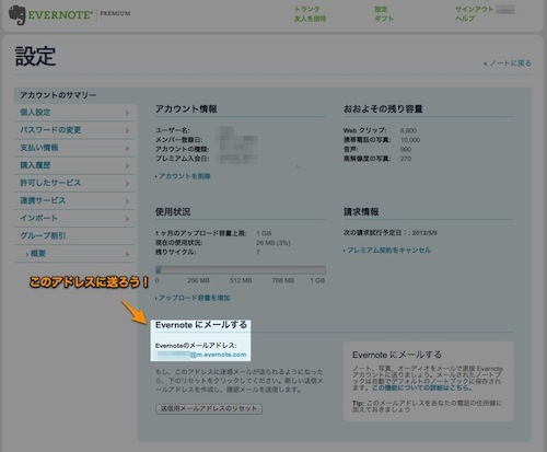 アドレスは、EvernoteのWebサイトの右上にある[設定]にあります。