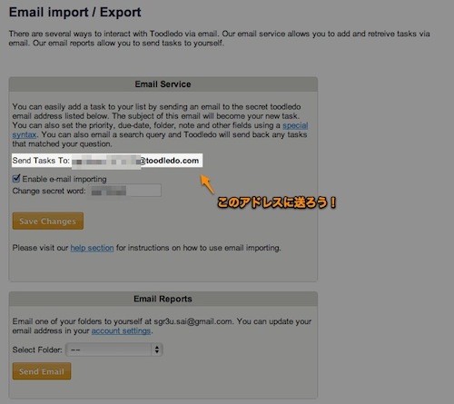 toodledoへのメール送信は、Toolsタブのmore…にあります。Email Import/Exportを選択してください。そのEmail Service画面にtoodledo用アドレスがあります。