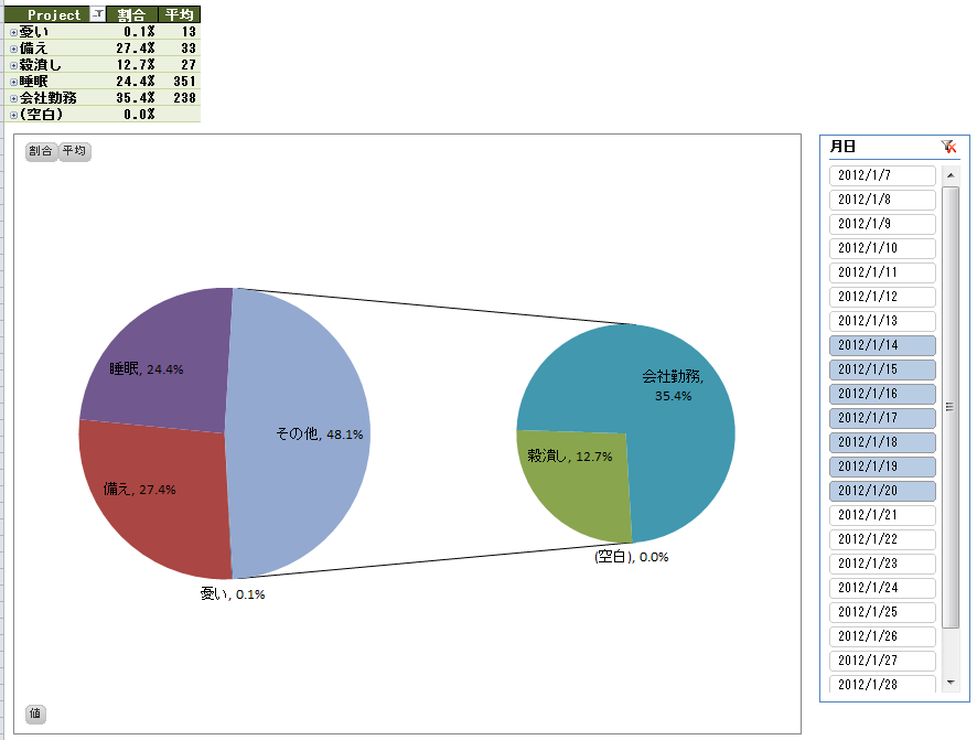 この分布は生活のバランスを直感的にチェックするのに役立ちます。バランスが崩れれば、作業ログから原因を確認することができます。生活を改善するトリガーとなるのです。