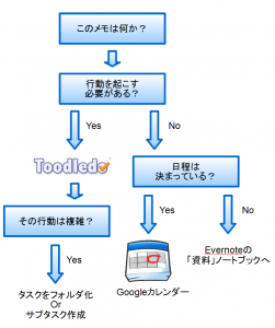 やるべきことはToodledoの中を見れば分かる、今後の予定はGoogleカレンダーを見れば分かる、参照すべき資料はEvernoteの資料ノートブックを見れば分かる。