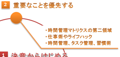 根幹をなすのは7つの習慣で言う第三の習慣に該当するもので、時間管理マトリクスの第二領域を優先する考え方にのっとっています。
