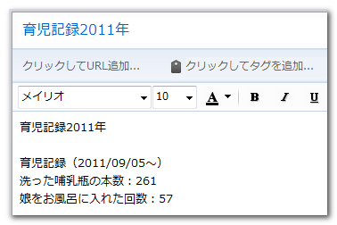 私は育児に関する記録をとっています。例えば、哺乳瓶を洗った本数、お風呂に入れた回数、食事をあげた回数、いっしょにいた時間の長さなどです。