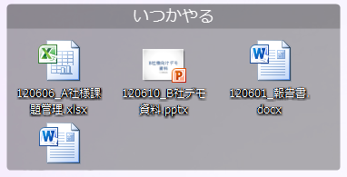 「120605_B社向けデモ資料.pptx」こんな感じですね。この場合は6/5までに作成しなきゃ!という資料になります。