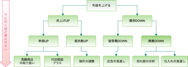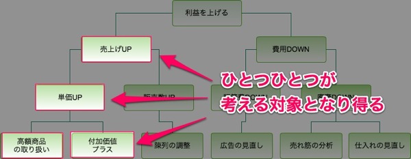 例えば先ほどの例でいえば、利益を2倍にする方法を考える前に、そもそも利益を上げるためにはどういう方法があるのかを考える。