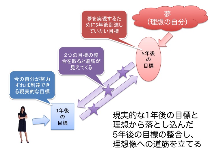 しかしながら、現実的な目標の延長線上では夢を達成できそうにもない場合は、理想像から落とし込んだある現実的且つチャレンジャブルな目標を立てる必要があります。流石に、10年後、20年後に自分がどうありたいかを思い描くのは難しいのですが、5年後であればある程度具体性を残した上で、理想から落とし込んだ「こうありたい」という姿をイメージすることが比較的容易です。