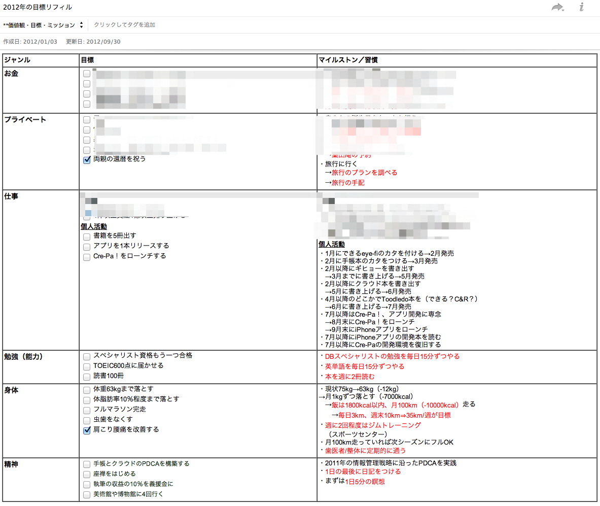 私は折に触れてこれらの目標を見返したいと考えているため、現時点で最も「いつでも」「どこでも」これらの情報にアクセス可能なEVERNOTEを用いてこれらの目標を管理していますが、ツールは手帳でもノートでも使い慣れた物をお使い頂ければと思います。
