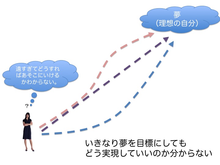 また、夢があれば当然それを叶えたいと思うわけですが、多くの場合「夢」というのは曖昧模糊としたイメージ(状態)でしかありません。そこに至るまでに何をすれば良いのかという道筋、何を達成すればその夢が叶ったと言えるのかという達成基準は別途設ける必要があります。