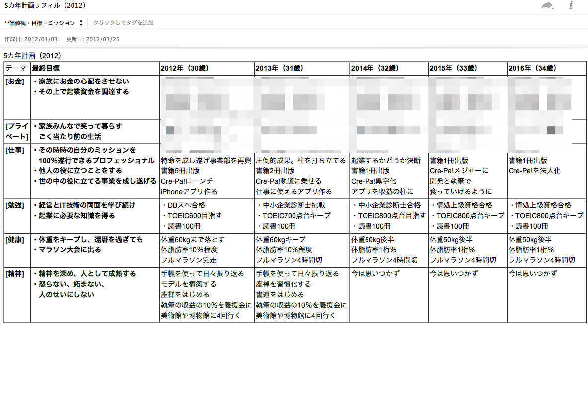 ここまでは、「目標を書き出す意義」 、「目標をレビューするためのミッション(欲求)」、「夢→目標→計画→行動に落とし込んでいくワークフロー」について取りあげて参りました。今回は夢を目標に変換していく具体的なツールとして5カ年計画と年間計画の2つを紹介したいと思います。