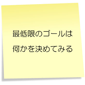 最低限のゴールが思いつかない場合のコツは、その結果を受け取る相手が何を求めているかを想像してみることです。最初の掃除の例では、お客さんだったらどこを見るかを考えますし、会議でしたら、自分たちが会議後どういう状態ならうれしいかを想像します。