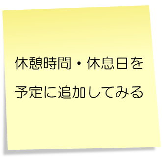 人は機械のように常に100%でフル稼働できません。1日のいつに休憩をとるか決めたり、スケジュール表を見て今から予め「休息をとる」と予定を追加してみてください。