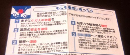 自動車保険の更新時にこの紙を新しいものに差し替えますが、その度に「事故に遭った時はここを見る」と言い聞かせていました。