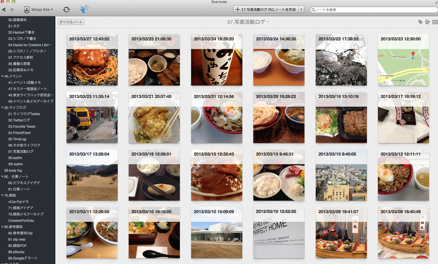 EVERNOTEに写真の活動ログは基本的にiPhoneで撮った写真かスクリーンショットで、Pictshareというアプリを用いて必要な写真を選んでまとめてEVERNOTEに送り込んでいます。Pictshareを使うと、ノート作成日とノートのタイトルを写真が撮影された日付にできるので、サムネイルで見返す作業がとても捗ります。