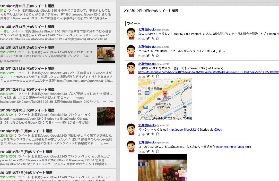 その他、私はTwitterに食事の写真や場所へのチェックイン、運動の記録などを流したりもするので、これも立派なライフログになります。ツイエバというサービスを使えば、Twitterのつぶやきを1日分まとめてEVERNOTEに取り込むことができ、振り返りが大変捗ります。