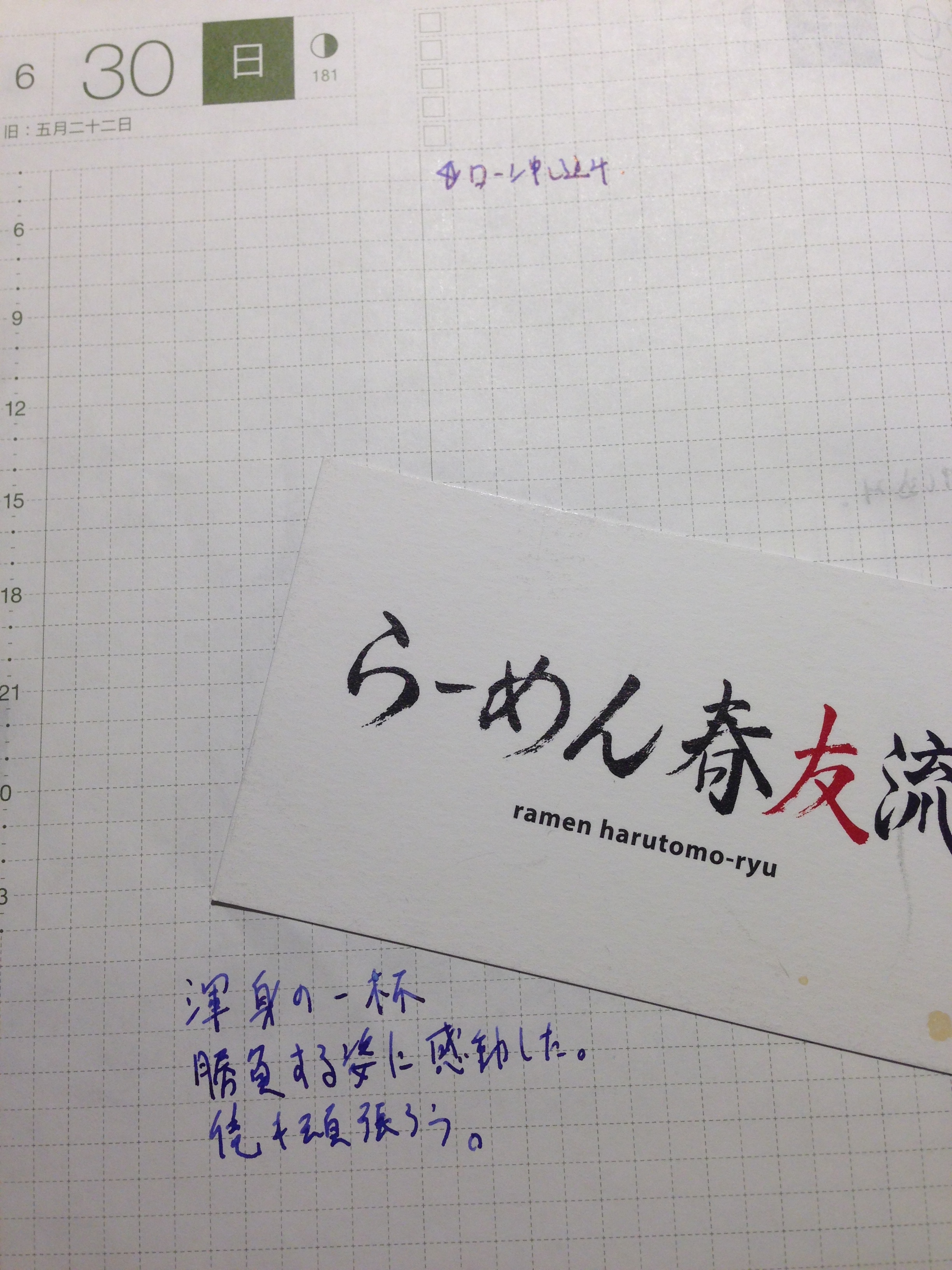 例えば、パラパラとページをめくっていくと、6/30のリフィルにラーメン春友流のショップカードが貼られていてそこに一言「渾身の一杯、勝負する姿勢に感動した。俺も頑張ろう。」というその時の心情が綴られている。すると、これを見た私の頭の中にはラーメン春友流で飲んだエーデルピルスの美味しさや、ラーメン屋を開業するという夢を叶えた春友さんのカッコイイ生き様に感動した気持ちが甦ってきます。