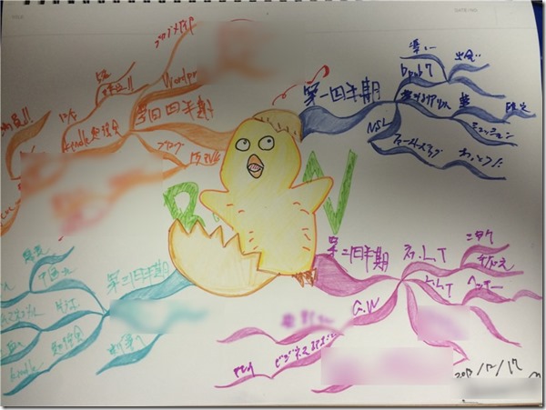 セントラルイメージが描き上がったら、次にBOI(Basic Ordering Idea)と呼ばれる太い枝を描いていきます。枝の上には今年一年を振り返る上で重要なキーワードを乗せていきます。