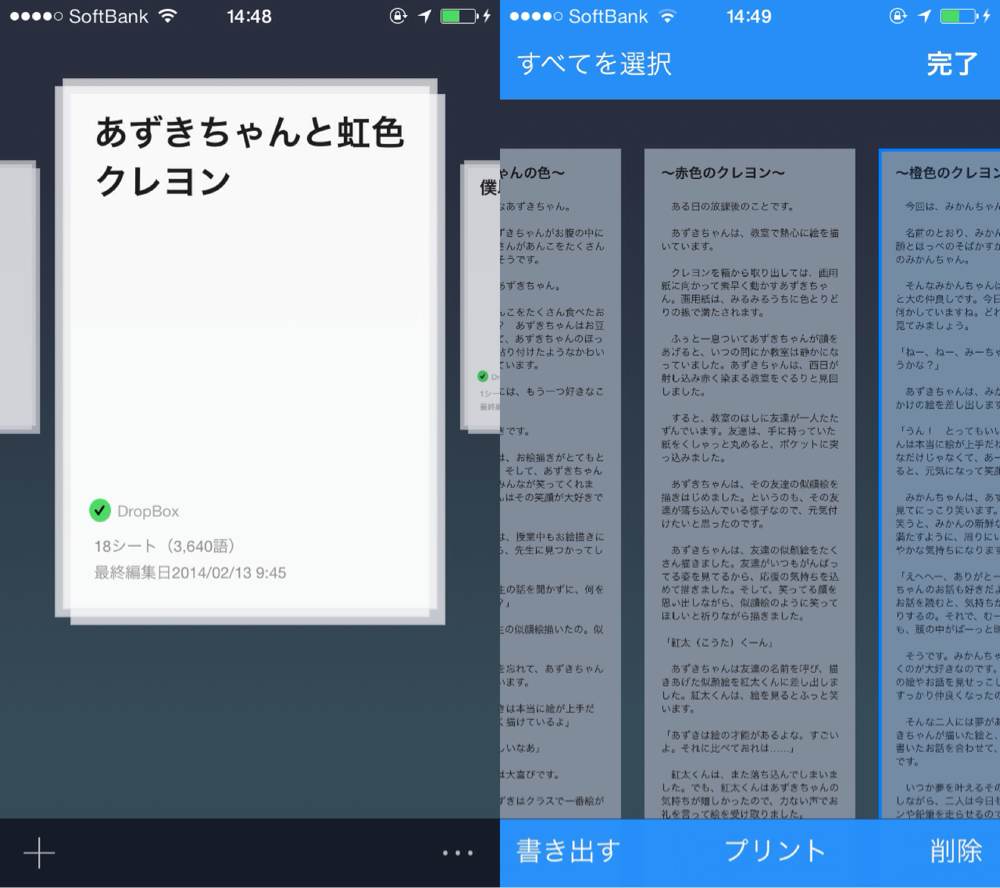 おっ、さりげなくボケてくるねー。さらにすごいのは、どちらもDropbox経由で同期できることなんだ。iライターズで書いて、Daedalus Touchでスタック単位で書き出したら、校正するときにとっても便利なんだよ!
