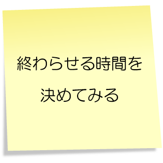 宣言した終了時間は何が何でも守らなければならないと杓子定規になる必要はありません。しかし最初はその時間を目標として行動して、予定の終了時間を過ぎてからは自由参加にした方がメリハリがつきますし、その時点で都合が悪い人は抜けやすくなっていいのかなと思います。