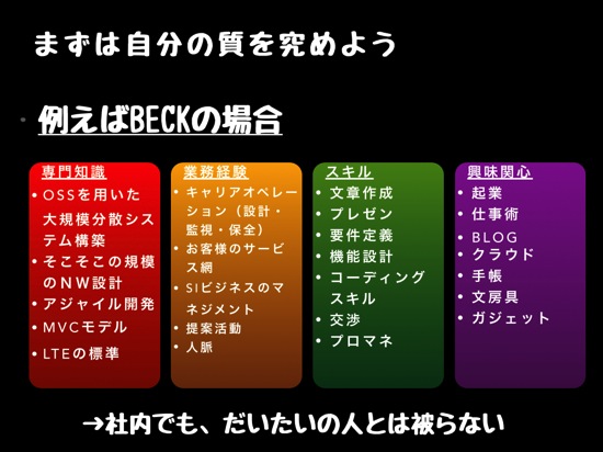今回は、まずは以下の4分類で自分の「質」を書き出し、質を究めるためのプランを練りましょうというお話から入り、