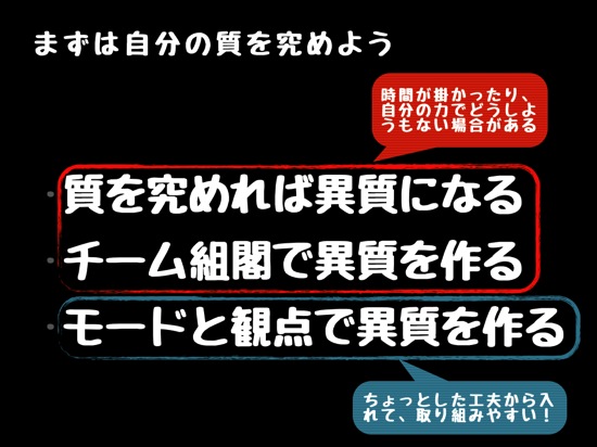 今回はこの内2つ、「質を究めれば異質になる」と「チーム組閣で異質を作る」の2つを詳しく見ていきましょう。