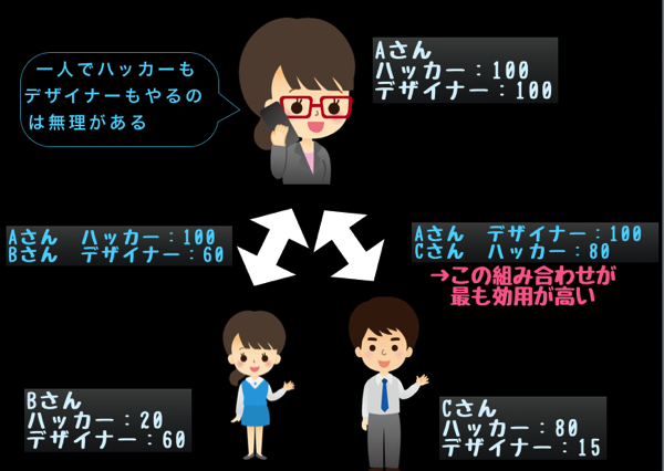 まぁ、小難しいことは抜きにして、絶対的に能力がある人に全部やらせるのは現実的ではないので、他者との組み合わせを考えた時「効用が最大となる組み合わせ」を探すと良い、位に考えて頂ければ途思います。