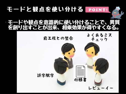 この様に分担を分ければ、一度のウォークスルー(全体通し)で3つの異なる観点からチェックを行う事ができます。それぞれの人がどの様なチェックを行うかというと、