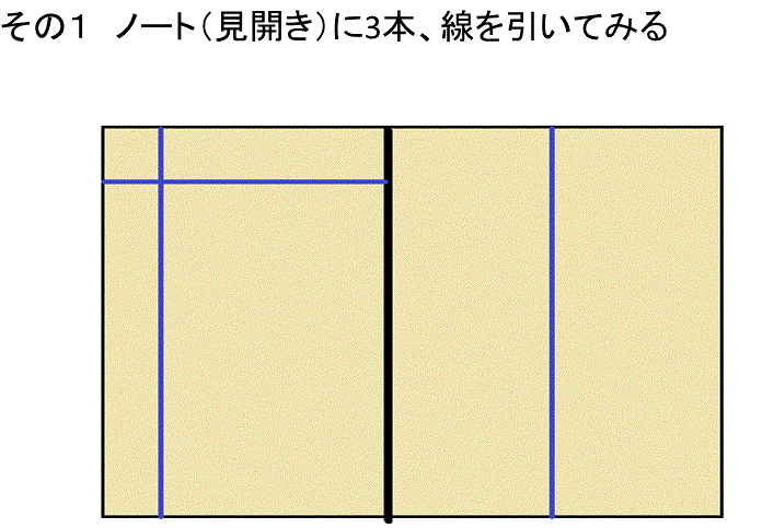 どちらの場面についても出てきた3本線ノート。これは、かつて自分のブログのほうではご紹介していたのですが、4月の「第3回アシタノワークショップ」のときにより詳しく解説したところ参加者に好評でしたので、あらためてご紹介したいと思います。