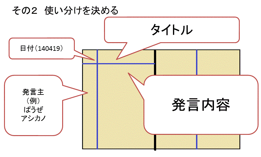 次に、分割したエリアの使い分けを決めます。オススメは、「向かって左側は議論の流れ、右側は自分の心の中の動き」という使い分けです。