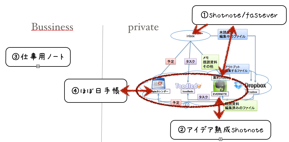 ちなみに、予定やタスク以外のメモについても、同じように紙のノートやメモ帳とEvernoteを使い分けています。