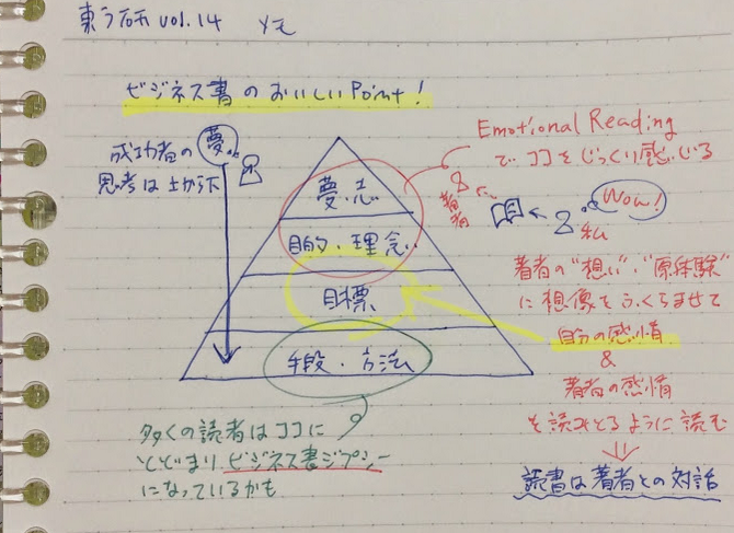 それと同時に、これは、手法や方法に目を向けたものではなく、その著者の夢や志という成功者の思考ピラミッドの上位レイヤーに目を向けることにつながります。そうしたことが、自分自信の目標設定や夢・志を形成することの一助になるのではないか?と思わされました。