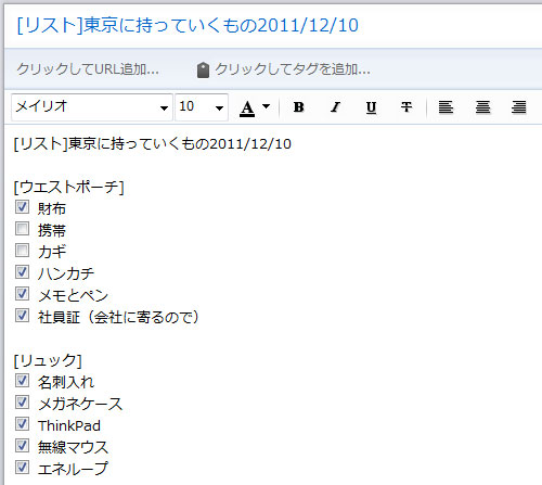 これは12月10日に私が東京へ出かけた際の持ち物チェックリストです。